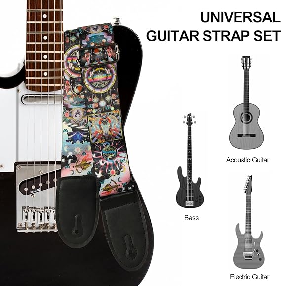 COMPLETE SET: The Guitar straps including 8pcs guitar picks , 4pcs gaskets, 2pcs headstock strap button, 2pcs headstock rope. Universal accessories are suitable for acoustic guitars, electric guitars, basses, and ukuleles, etc.