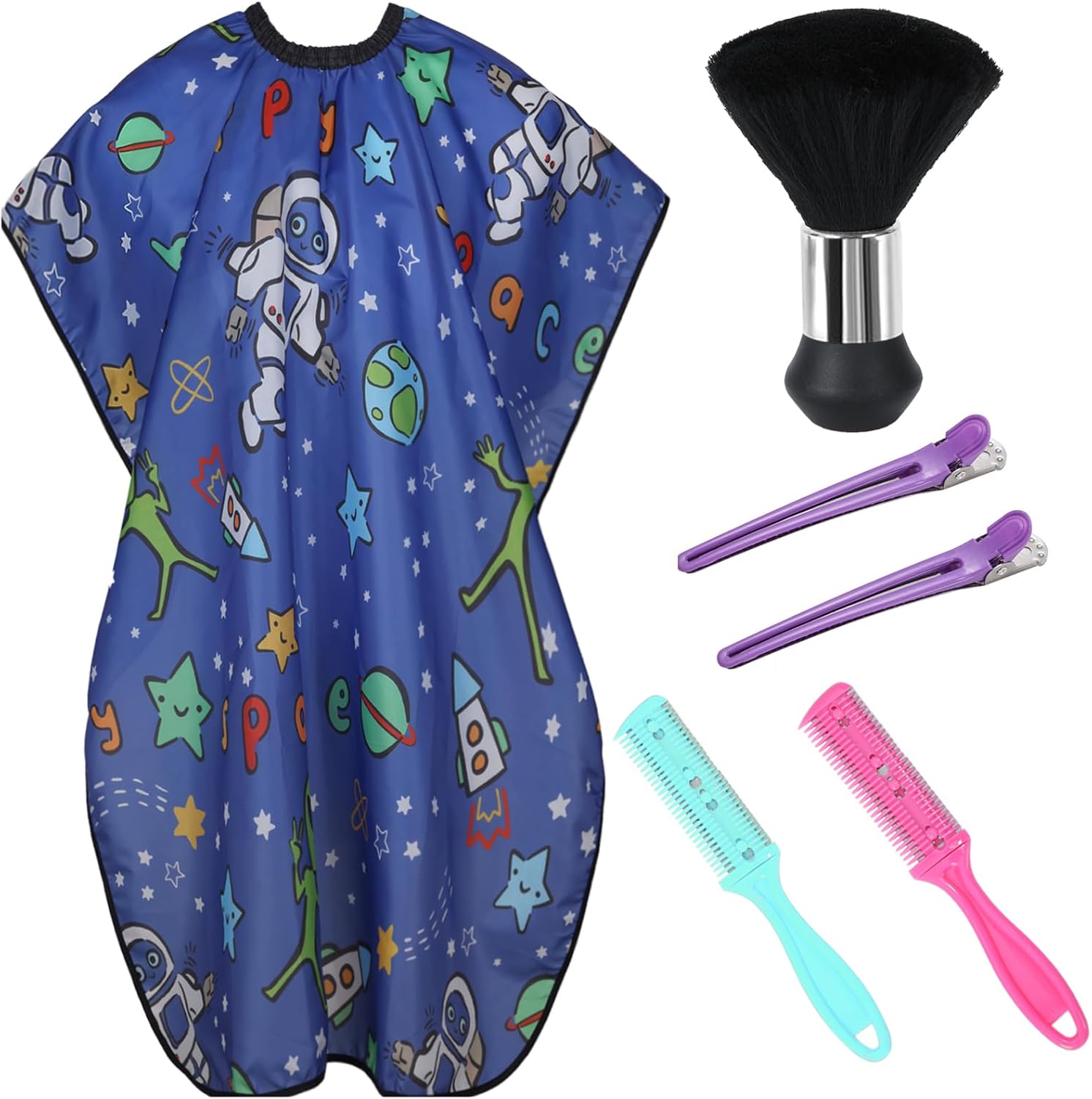 Cobahom Kids Hair Cutting Cape 47.3″×31.5” Professional Barber Cape Child Cartoon Hairdresser Apron with Adjustable Closure, Clips, Double Edge Razor,Neck Duster Brush (Spaceman, Alien)