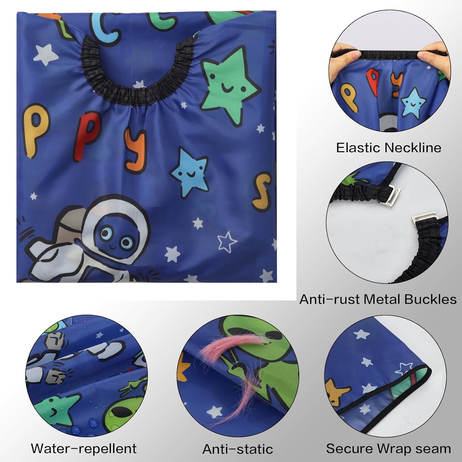 Adjustable Buckle Closure: Professional kids barber cape boasts an elastic neckline and two metal buckles that allow a flexible adjustment to fit any neck size to avoid broken hair falling into the collar.